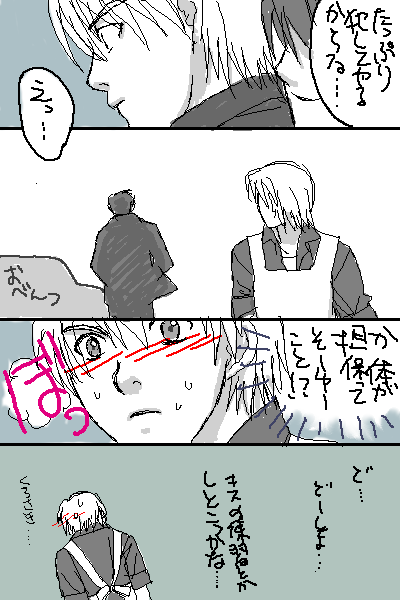 PBBS雑漫画。 樋口って、壱哉に対して頭が悪いというか、思考の幅が他の標的に比べて極端に狭そうです。 それは多分10年前の恋をいまだに引きずってるからだと思うのですが。 「俺の体にあんな金出すなんておまえも馬鹿だ」などと壱哉に云ってるところを見ると、金なんか出さなくてもどのみち陥落するのに、みたいな気持ちで花束持ってったんだろうなあとか思っちゃいます。だからこそ犬EDとか切ないわけで。 …せめて文字くらいは活字を使いたいのですが、私のIEだとこのPBBSの活字ツールに対応できない…。 |